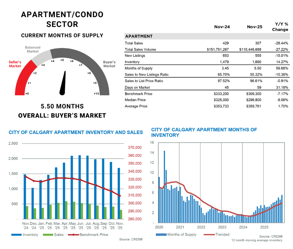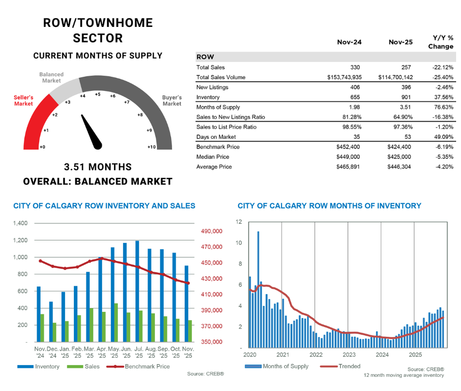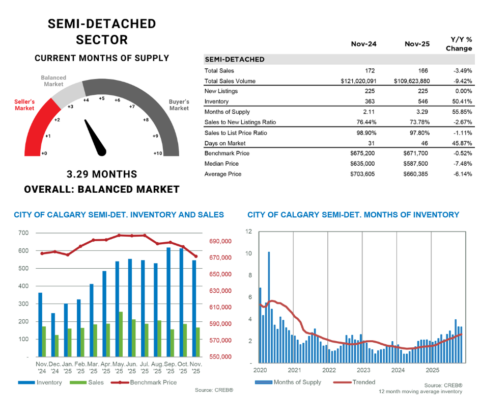 “Supply levels have been sitting higher than typical levels for the past three months, mostly due to the gains occurring in the higher-density sectors of row and apartment style units,” said Ann-Marie Lurie, CREB®’s Chief Economist. “This is partially related to the additional supply choice coming from the new homes sector, some of which end up on the resale market, especially near the end of the year. While buyer’s market conditions are more prevalent for apartment-style homes and to a lesser extent row homes, outside of a few pockets of the market, both the detached and semi-detached markets are relatively balanced.”