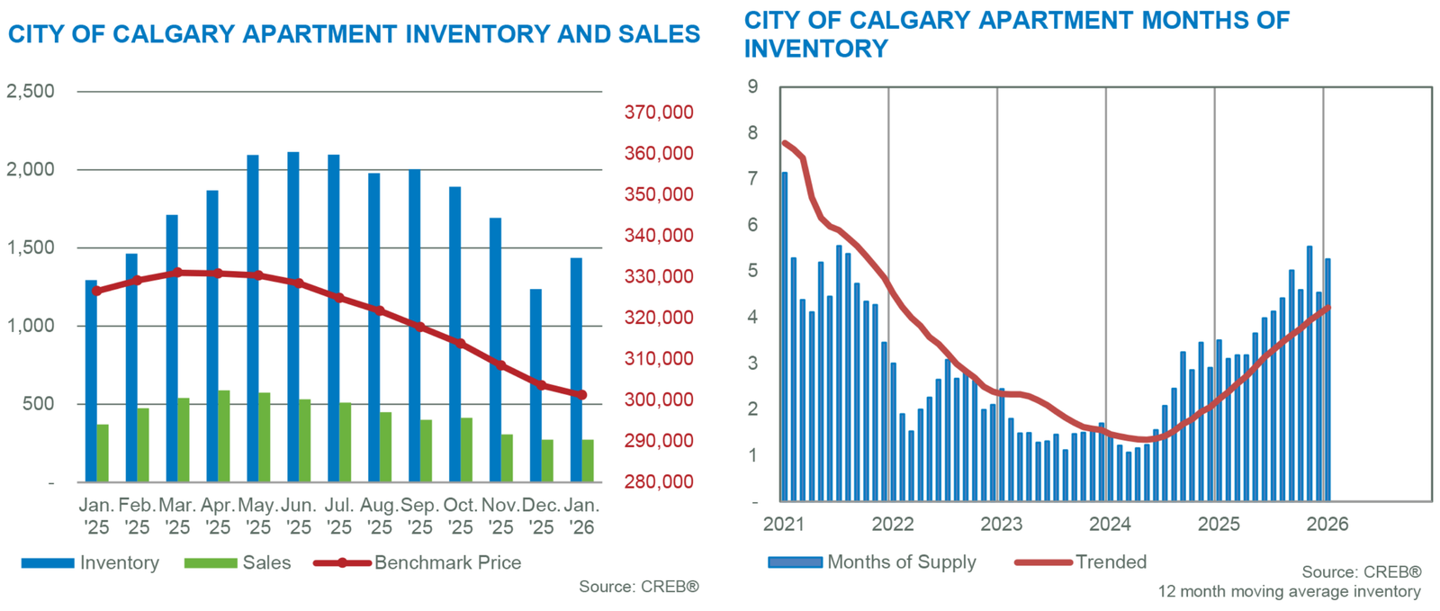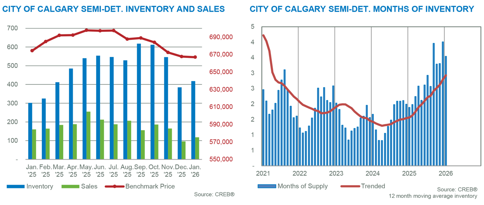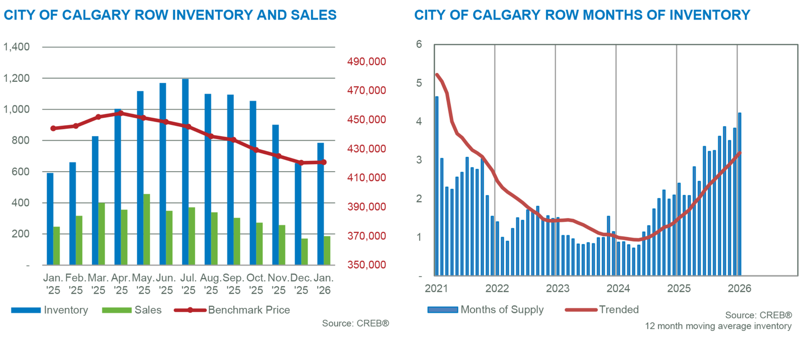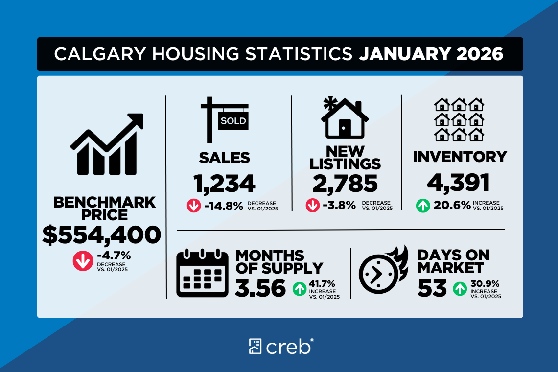 Calgary reported 1,234 sales in January, a year-over-year decline of 15%, but in line with typical levels of activity for the month. While sales declined across all property types, the steepest declines occurred in higher-density homes.