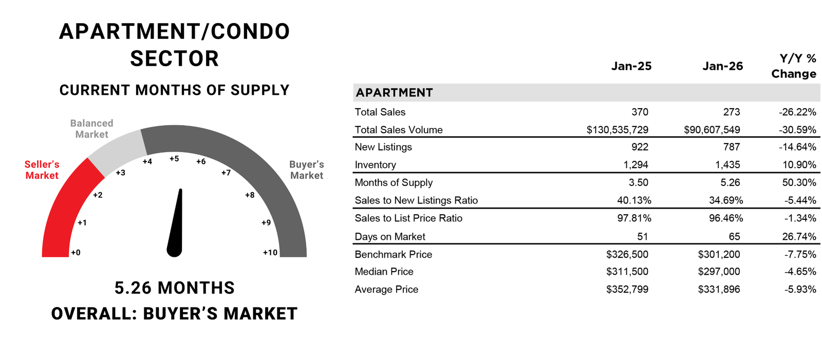Apartment-style units continue to struggle with supply. New listings reached 787 units, which is not as high as last year but a significant jump over December and much higher than the 273 sales reported in January, pushing the sales-to-new-listings ratio down to 35%. This drove further gains in inventory, which reached 1,435 units, the highest levels ever reported for January.