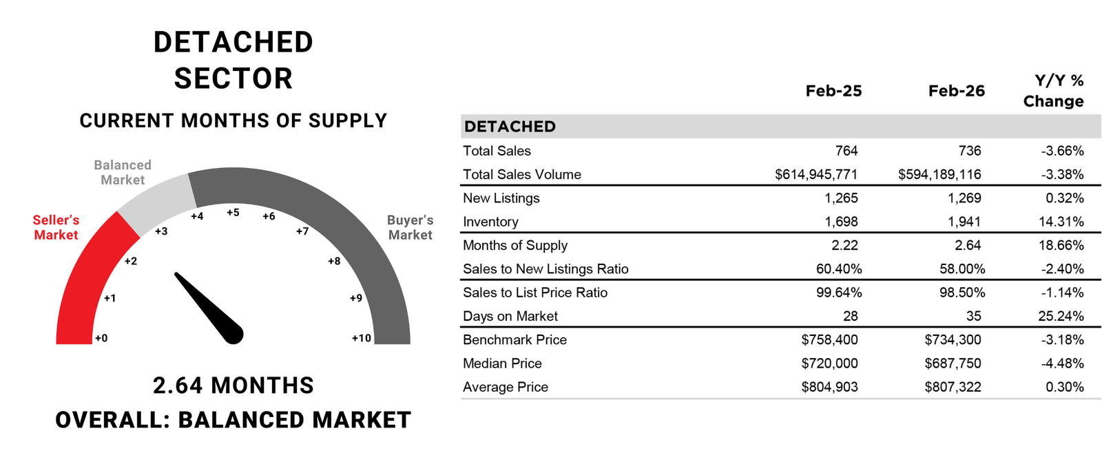Tighter conditions for detached homes offset the higher supply levels in the apartment condominium sector, leaving citywide conditions relatively balanced at three months of supply and a sales-to-new-listings ratio of 55%. Inventory levels reached 4,822 units in February, with condominiums and row homes representing more than half of all the inventory. At the same time, there were 1,526 sales in February, an 11% decline over last February, mostly due to a sharp pullback in row and apartment sales.
