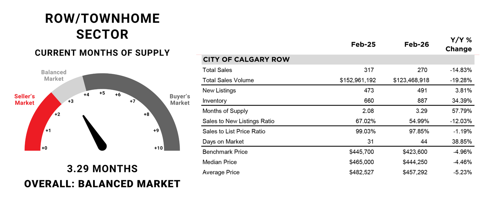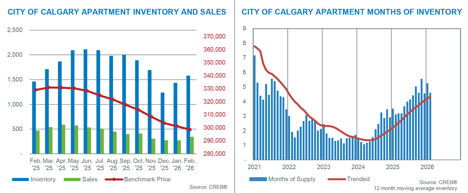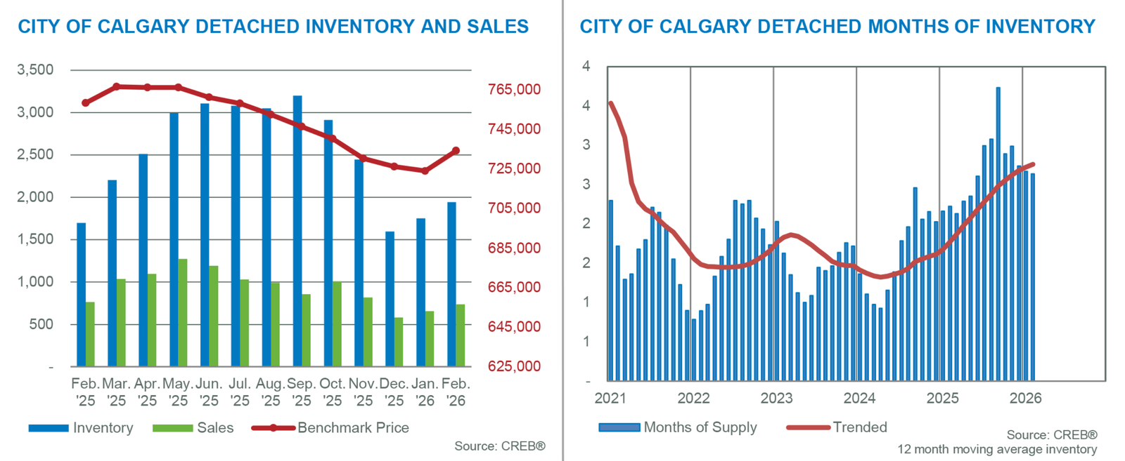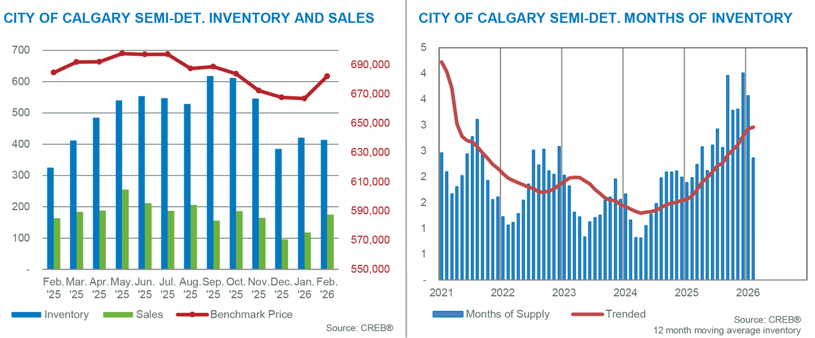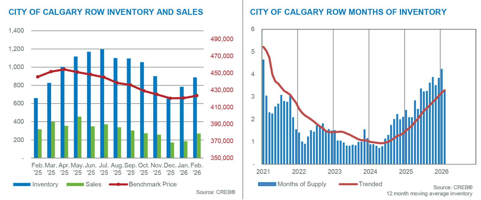 Calgary continued to see market conditions vary by property type in February. The tightest conditions occurred in detached and semi-detached properties, reporting less than three months of supply. Row homes reported slightly higher supply levels relative to demand but remained relatively balanced. Meanwhile, apartment-style properties are dealing with excess supply, as conditions continue to favour the buyer.