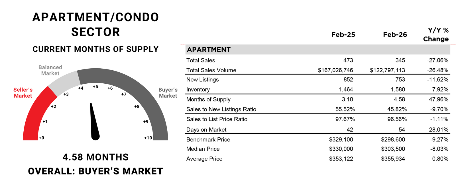 Despite a pullback in new listings in February, with 753 new listings and 345 sales, the sales-to-new-listings ratio remained low at 46%, contributing to further inventory gains. February reported 1,580 units in inventory, high enough to keep the months of supply well over four months. The persistently higher supply levels continued to weigh on prices in February, as the monthly benchmark price dropped to $298,600, nearly 1% below January and over 9% lower than prices reported last February.