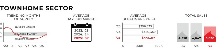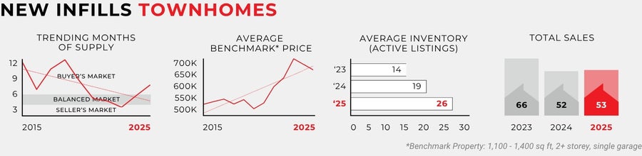 The new infill townhome sector ended the year with 53 sales, relatively unchanged from 2024. This was mostly due to rising inventory levels providing buyers with more purchasing opportunities. Rising inventories and a softer overall market did lead benchmark pricing for new infll townhomes to drop by 3% in 2025.