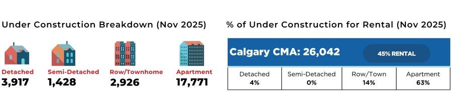 New-home starts exceeded expectations in 2025, with levels approaching another record high. As of November, starts totalled 26,439, surpassing the 2024 annual total of 24,369. Starts have been elevated since 2022, as the new-home sector responded to a supply shortage caused by a sudden increase in migration. However, as the number of migrants entering Calgary slows and segments of the market show signs of excess supply, we should begin to see a pullback in new home starts in 2026.