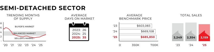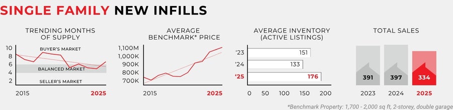 The single-family new infill sector ended the year with 334 sales, down 16% from its peak in 2024. Slowing sales and rising listings did impact inventory levels, which rose through 2025. Average inventories in the single family sector were 176 through 2025, the highest level since 2020. Despite the slower market, prices overall remained quite strong in the single family sector, with benchmark pricing actually rising in 2025 by 3%.
