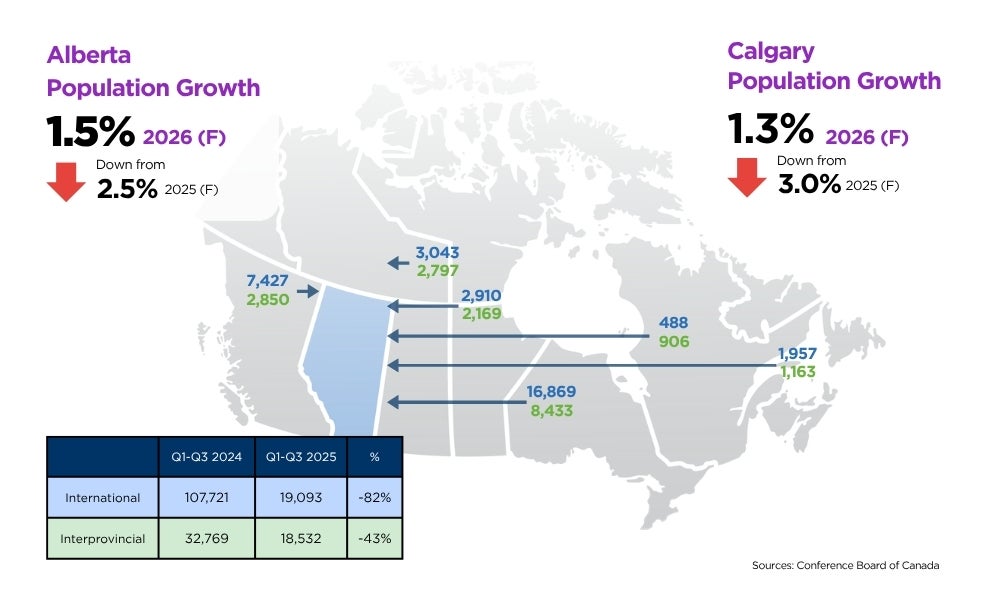 Population growth from 2022 to 2024 fueled housing supply challenges. 2025 estimates indicate a larger-than-expected decline in the number of migrants. In 2026, migration should further ease as more temporary migrants leave and fewer international arrivals occur. Interprovincial migration is also expected to slow due to weak employment and high unemployment in Calgary.