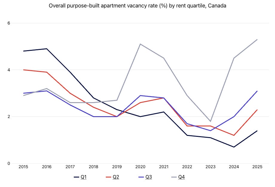 This shift represents a move away from the extremely tight rental conditions seen in recent years. As vacancies rise, landlords have less pricing power, leading to slower rent growth and declines in higher-priced or newly completed units.