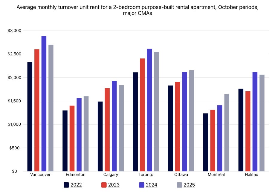 Looking at major cities, rents have softened across all six of Canada’s largest urban centres. Calgary recorded the most significant decline (-5.0%), while Montreal saw only a slight decrease (-1.6%). Toronto rents have dropped to their lowest level in nearly four years, and while Vancouver has seen some recent monthly increases, rental rates remain below early 2022 levels.
