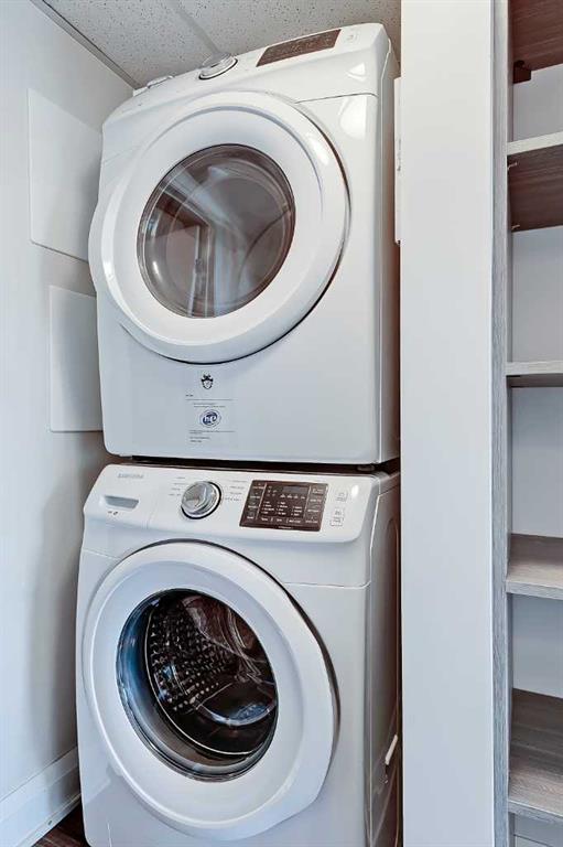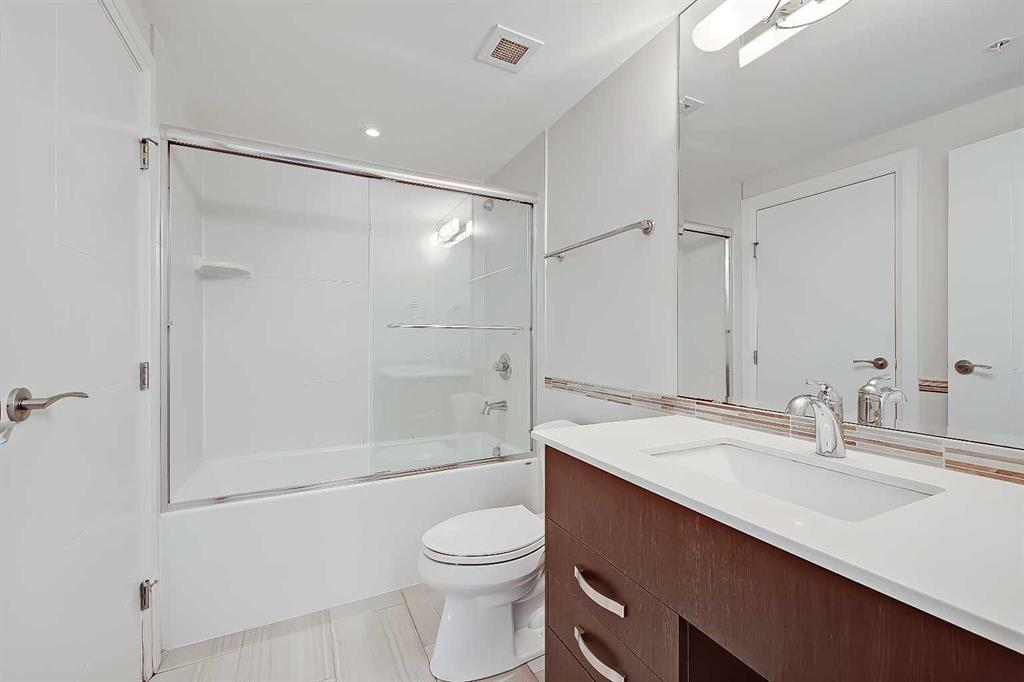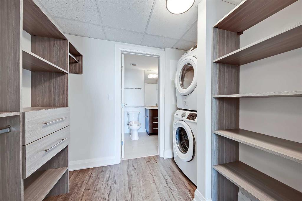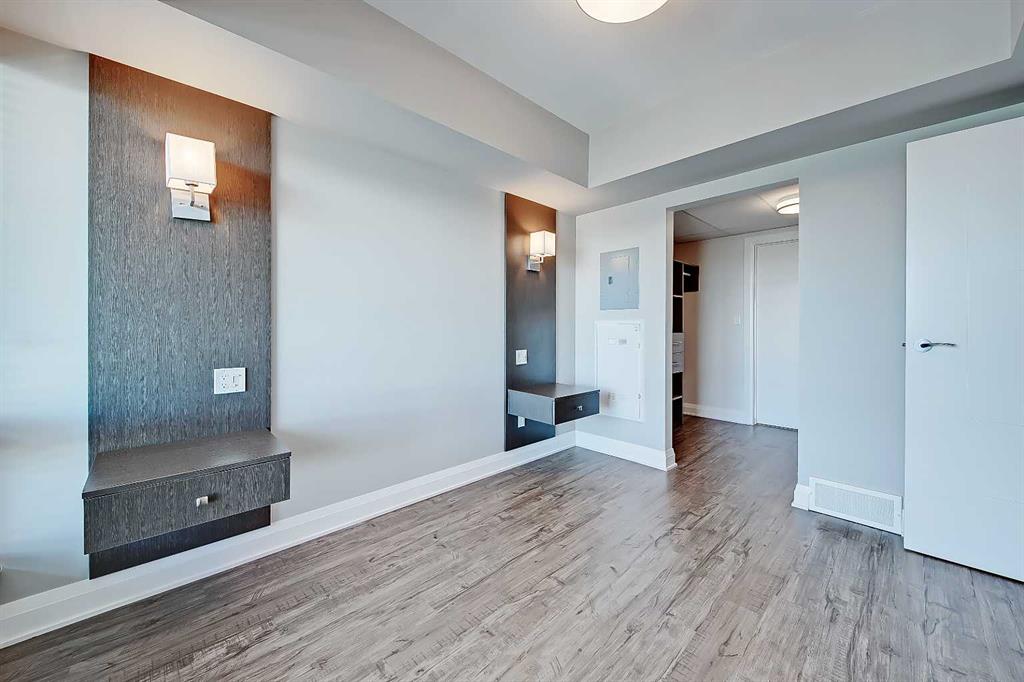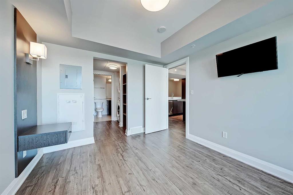 The bedroom features a ceiling-height window overlooking the balcony and the city beyond, custom wall panelling with built-in side tables, wall sconce lighting, a convenient receptacle with a USB port, and an included wall-mounted TV. The vast walk-thru closet features built-in custom organizers as well as a stacked in-suite laundry. The oversized closet also provides cheater access to the main 4-piece bathroom complete with occupancy-sensored lights, quartz countertops, tile wainscoting, an undermount sink with a modern faucet, a tile backsplash, a modern vanity with storage, tile flooring, and a large tub/shower combo with full-height tile and an upgraded glass door.