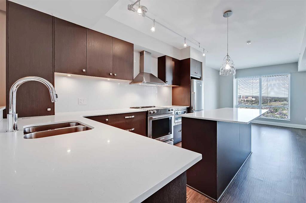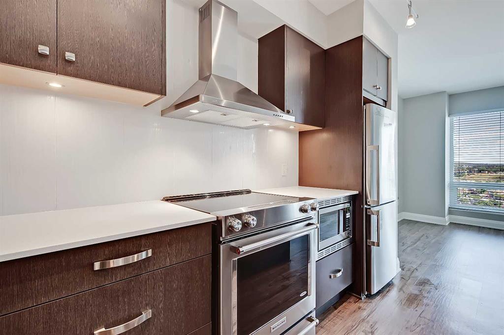 The modern kitchen features a custom-designed central island with quartz countertops, modern cabinets with under-cabinet lighting, a dual-basin undermount stainless steel sink, a tile backsplash, and an upgraded stainless-steel appliance package, including a built-in microwave, a KitchenAid stove with a flat cooktop, a fridge/freezer combo, and a chimney-style hood fan. With ample storage and unobstructed views of the entire unit, this space was designed with style and functionality in mind.