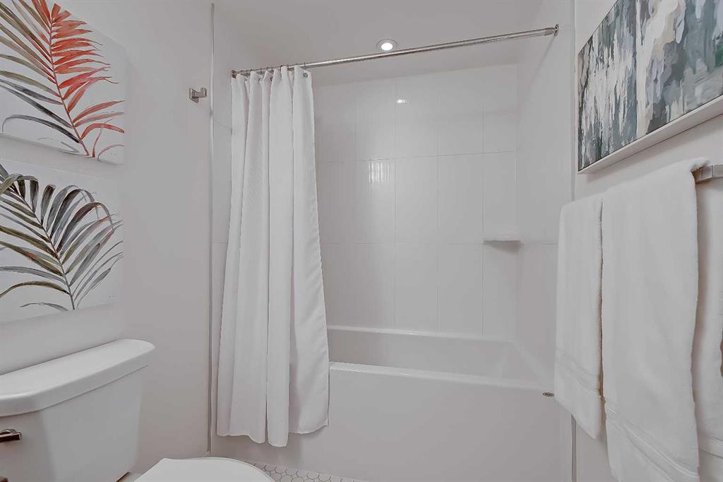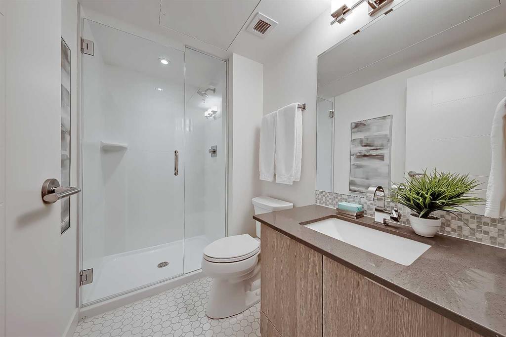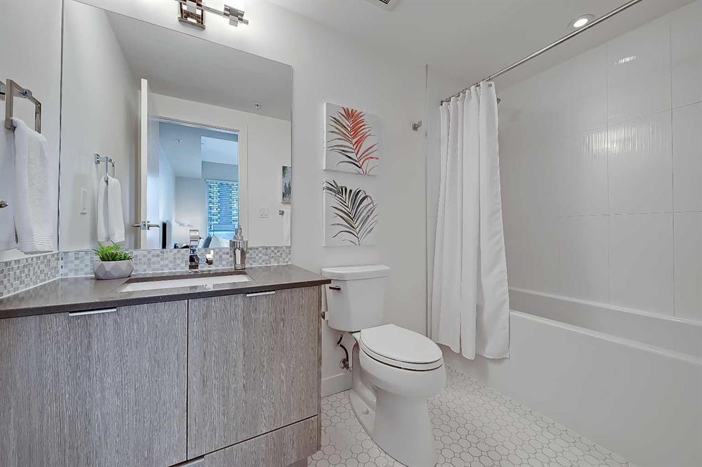 Featuring two large bedrooms, this unit has room to breathe and is great for roommates or overnight guests. The primary bedroom boasts expansive floor-to-ceiling windows on two sides, a large closet, and tons of space for bedroom furniture. The designer ensuite features contemporary tile floors, granite countertops and a luxurious tub/shower with a full-height tile surround.