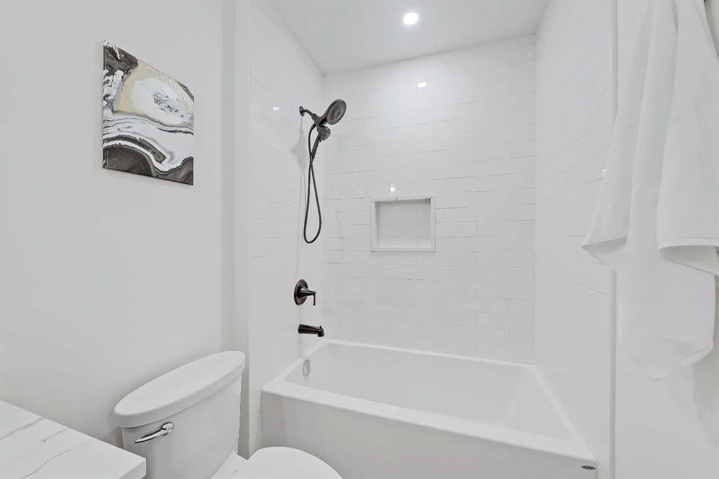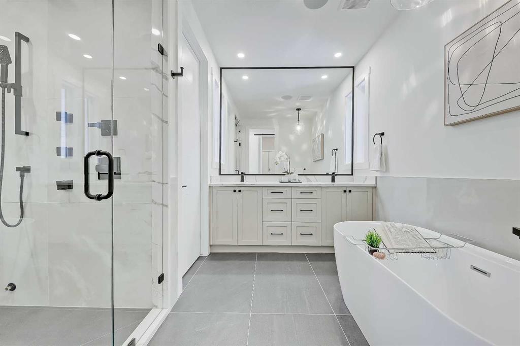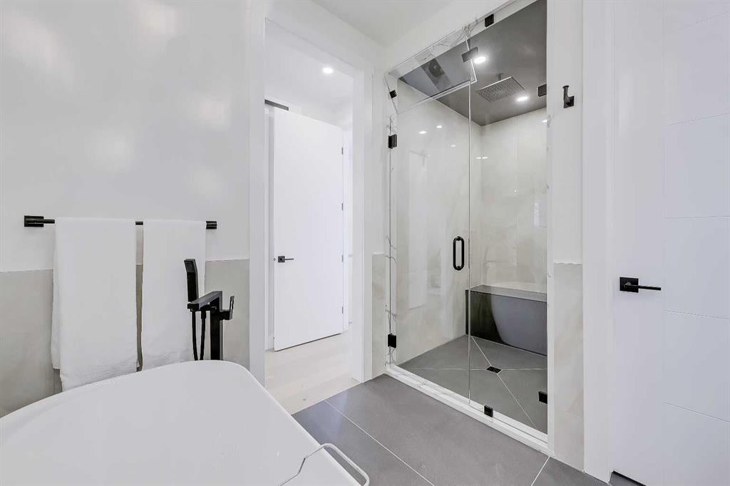 Upstairs, 9-foot ceilings and engineered hardwood flooring continue throughout. The primary retreat offers a vaulted ceiling, oversized windows, built-in speakers, and flexible space for a reading nook or home office. The spa-like 5-piece ensuite features heated tile floors, a freestanding soaker tub, dual vanities with quartz counters, and a fully tiled walk-in shower with rainfall head, body jets, and steam rough-in. Two additional bedrooms with walk-in closets, a beautifully finished main bath, and a dedicated laundry area complete the upper level.